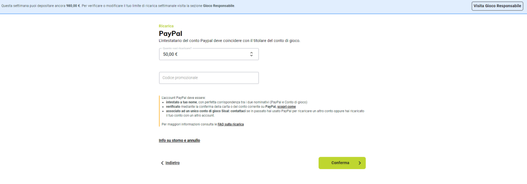 Il deposito viene effettuato seguendo tutti gli step necessari per il metodo di pagamento selezionato. Negli screenshot più in alto puoi vedere chiaramente come si effettua un deposito tramite PayPal su Sisal, fra i migliori siti di scommesse italiani.